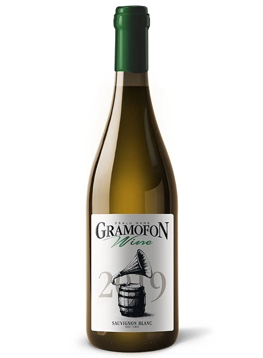 Gramofon Sauvignon Blanc este un vin alb sec, certificat DOC-CMD Dealu Mare, obținut din struguri de tip Sauvignon Blanc culeși din recolta 2019.