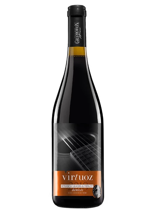 Gramofon Virtuoz Feteasca Neagra & Merlot este un vin roșu demisec, din gama Virtuoz, certificat DOC-CMD Dealu Mare, un cupaj obținut din struguri de tip Feteasca Neagra si Merlot, culeși din recolta 2018.